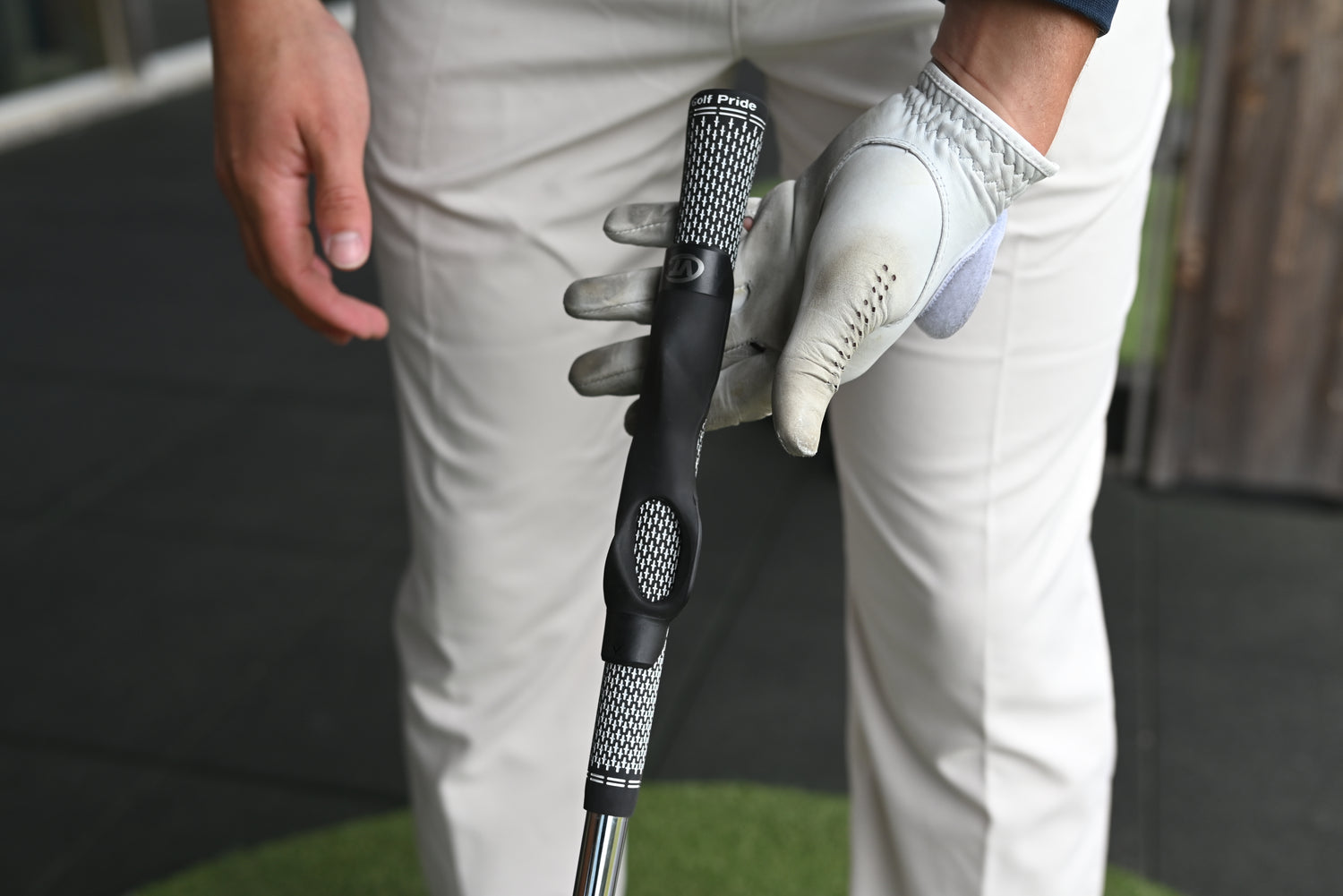Schuif de grip trainer stevig op je golfclub, recht uitgelijnd met het clubblad.